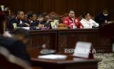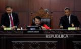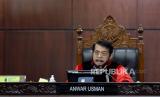 REPUBLIKA.CO.ID,JAKARTA -- Ketua Majelis Hakim Mahkamah Konstitusi Anwar Usman bersiap memimpin sidang pembacaan putusan di Ruang Sidang Pleno Gedung MK, Jakarta, Senin (16/10/2023). Mahkamah Konstitusi (MK) menolak gugatan uji materi batas usia minimal calon presiden (capres) dan calon wakil presiden (cawapres) dalam Undang-Undang Nomor 7 Tahun 2017 tentang Pemilu yang diajukan Partai Solidaritas Indonesia (PSI). MK menolak syarat usia capres-cawapres diturunkan menjadi 35 tahun.