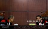 Ketua Majelis Hakim Mahkamah Konstitusi (MK) Anwar Usman (kanan) berbincang dengan Majelis Hakim MK Saldi Isra dalam sidang pembacaan putusan di Ruang Sidang Pleno Gedung MK, Jakarta, Senin (16/10/2023). Mahkamah Konstitusi (MK) menolak gugatan uji materi batas usia minimal calon presiden (capres) dan calon wakil presiden (cawapres) dalam Undang-Undang Nomor 7 Tahun 2017 tentang Pemilu. MK menolak syarat usia capres-cawapres diturunkan menjadi 35 tahun. Dengan begitu usia minimal 40 tahun tetap menjadi syarat bagi capres dan cawapres. (FOTO : Republika/Prayogi)
