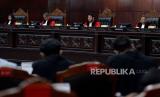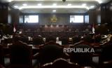 Suasana sidang pembacaan putusan di Ruang Sidang Pleno Gedung MK, Jakarta, Senin (16/10/2023). Mahkamah Konstitusi (MK) menolak gugatan uji materi batas usia minimal calon presiden (capres) dan calon wakil presiden (cawapres) dalam Undang-Undang Nomor 7 Tahun 2017 tentang Pemilu. MK menolak syarat usia capres-cawapres diturunkan menjadi 35 tahun. Dengan begitu usia minimal 40 tahun tetap menjadi syarat bagi capres dan cawapres. (FOTO : Republika/Prayogi)