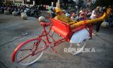 Instalasi seni penarik becak onthel di Jalan Malioboro, Yogyakarta, Senin (16/10/2023). Berbagai patung atau instalasi seni akan dijumpai di berbagai titik Jalan Malioboro hingga Titik Nol Kilometer Yogyakarta dalam rangka Jogja Street Sclupture Project (JSSP) 2023. Pada pameran patung luar ruangan terbesar di Indonesia JSSP ke-5 ini mengangkat tema Ruwat Gatra Rasa. Pameran ini diadakan sebagai salah satu cara merayakan Sumbu Filosofis Yogyakarta sebagai Warisan Budaya UNESCO. Pengunjung dapat menikmati hiburan tambahan aneka bentuk patung hingga 28 Oktober mendatang di Malioboro. (FOTO : Republika/Wihdan Hidayat)