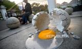 Patung telu yang pecah di depan Gedung Agung Yogyakarta, Senin (16/10/2023). Berbagai patung atau instalasi seni akan dijumpai di berbagai titik Jalan Malioboro hingga Titik Nol Kilometer Yogyakarta dalam rangka Jogja Street Sclupture Project (JSSP) 2023. Pada pameran patung luar ruangan terbesar di Indonesia JSSP ke-5 ini mengangkat tema Ruwat Gatra Rasa. Pameran ini diadakan sebagai salah satu cara merayakan Sumbu Filosofis Yogyakarta sebagai Warisan Budaya UNESCO. Pengunjung dapat menikmati hiburan tambahan aneka bentuk patung hingga 28 Oktober mendatang di Malioboro. (FOTO : Republika/Wihdan Hidayat)