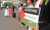 Sejumlah peserta aksi menunjukkan poster yang bertulis solidaritas terhadap Palestina di simpang lima DPRD Provinsi Sumsel Palembang, Sumsel, Senin (16/10/2023). Aksi yang diikuti puluhan Aliansi Pemuda Sumsel Bergerak ini mengecam tindakan Israel terhadap Palestina. (FOTO : ANTARA FOTO/Feny Selly)