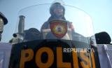 Aparat menggunakan perlengkapan Dalmas saat Apel Gelar Pasukan Operasi Mantap Brata Progo 2023-2024 di halaman Balikota Yogyakarta, Selasa (17/10/2023). Apel gelar pasukan gabungan ini dalam rangka pengamanan Pemilu serentak 2024 mendatang. Selain itu, berbagai peralatan pendukung pengamanan juga turut dipamerkan, mulai pakaian Dalmas, senapan pelontar gas air mata, serta senapan serbu. Usai pelaksanaan apel dilanjutkan dengan pemusnahan barang bukti hasil operasi cipta kondisi jelang Pemilu 2024 Polresta Yogyakarta. Barang bukti yang dimusnahkan diantaranya knalpot brong, minuman keras, dan obat-obatan terlarang. (FOTO : Republika/Wihdan Hidayat)