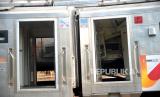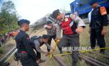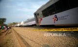 Petugas memasang tanda dilarang melintas pada lokasi anjloknya Gerbong Kereta Api Argo Semeru anjlok di Stasiun Kali Menur, Sentolo, Kulonprogo, Yogyakarta, Selasa (17/10/2023). KA Argo Semeru relasi Surabaya Gubeng-Gambir anjlok di Stasiun Kali Menur dan menemper KA Argo Wilis relasi Bandung-Surabaya Gubeng. Dalam kecelakaan ini tidak ada korban jiwa. (FOTO : Republika/Wihdan Hidayat)