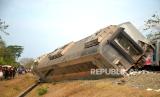 Gerbong Kereta Api Argo Semeru anjlok di Stasiun Kali Menur, Sentolo, Kulonprogo, Yogyakarta, Selasa (17/10/2023). KA Argo Semeru relasi Surabaya Gubeng-Gambir anjlok di Stasiun Kali Menur dan menemper KA Argo Wilis relasi Bandung-Surabaya Gubeng. Dalam kecelakaan ini tidak ada korban jiwa. (FOTO : Republika/Wihdan Hidayat)