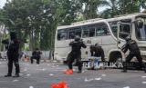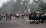 REPUBLIKA.CO.ID, PEKAN BARU. -- Massa melempari polisi saat terjadi kerusuhan menolak hasil Pemilihan Umum (Pemilu) 2024 dalam simulasi Sistem Pengamanan Kota (Sispamkota) di Kota Pekanbaru, Riau, Selasa (17/10/2023).