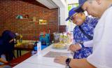 Direktur Utama PT Bank Tabungan Negara (Persero) Tbk. Nixon LP Napitupulu memilih baju buatan Usaha Mikro Kecil dan Menengah (UMKM) binaan Bank BTN di Mandalika, NTB, pekan lalu. (FOTO : Dok.Republika)