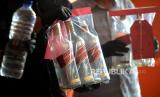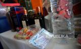 Petugas menunjukkan barang bukti minuman keras oplosan saat gelar perkara kasus miras oplosan di Polres Bantul, Yogyakarta, Rabu (18/10/2023). Kedua tersangka ditangkap anggota Polres Bantul usai meninggalnya TM usai pesta miras bersama RB dan diracik oleh YS. Miras oplosan ini dibuat menggunakan alkohol sisa bahan dekontaminasi APD nakes saat pandemi covid19 yang lalu. Setelah ditelusuri ternyata YS peracik miras dan menjualnya dengan kemasan asli serta memiliki pita cukai palsu sejak 2022. Akibat perbuatannya YS dan RB dijerat Pidana Pasal 204 dengan ancaman hukuman 20 tahun penjara. (FOTO : Republika/Wihdan Hidayat)