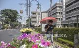 Warga menggunakan payung saat melintasi Jalan Asia Afrika, Kota Bandung, Jawa Barat, Rabu (18/10/2023). Badan Meteorologi, Klimatologi, Geofisika (BMKG) Bandung mencatat suhu maksimum atau terpanas Kota Bandung mencapai 35,6 derajat celcius pada awal Oktober 2023. Bulan Oktober tahun ini menjadi rekor suhu terpanas di Kota Bandung. (FOTO : ABDAN SYAKURA/REPUBLIKA)