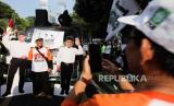 Sejumlah pendukung pasangan bakal calon presiden Anies Baswedan dan bakal calon wakil presiden Muhaimin Iskandar memeriahkan pawai di Jakarta, Kamis (19/10/2023). Pasangan bakal capres dan bakal cawapres yang diusung Koalisi Perubahan tersebut mendaftarkan diri mereka sebagai peserta dalam Pemilihan Presiden (Pilpres) 2024. (FOTO : Republika/Putra M. Akbar)