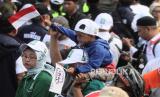 Seorang anak mengikuti pawai bakal calon presiden Anies Baswedan dan bakal calon wakil presiden Muhaimin Iskandar di Jakarta, Kamis (19/10/2023). Pasangan bakal capres dan bakal cawapres yang diusung Koalisi Perubahan tersebut mendaftarkan diri mereka sebagai peserta dalam Pemilihan Presiden (Pilpres) 2024. (FOTO : Republika/Putra M. Akbar)