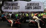 Sejumlah pendukung pasangan bakal calon presiden Anies Baswedan bersama bakal calon wakil presiden Muhaimin Iskandar memeriahkan pawai di Jakarta, Kamis (19/10/2023). Pasangan bakal capres dan bakal cawapres yang diusung Koalisi Perubahan tersebut mendaftarkan diri mereka sebagai peserta dalam Pemilihan Presiden (Pilpres) 2024. (FOTO : Republika/Putra M. Akbar)