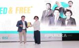 Direktur Utama BSI Hery Gunardi (kiri) memberikan plakat kepada Rektor UGM Yogyakarta Ova Emilia (kanan) pada acara Sharia Financial Literacy: Young, Blessed & Free yang berlangsung di Grha Sabha Universitas Gadjah Mada Yogyakarta, Kamis (19/10/2023). PT Bank Syariah Indonesia Tbk. (BSI) terus berupaya mendorong peningkatan literasi dan inklusi keuangan syariah di dalam negeri. BSI berharap mahasiswa dapat menjadikan bank syariah sebagai salah satu referensi utama saat mereka masuk dunia kerja. (FOTO : Dok Republika)
