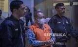REPUBLIKA.CO.ID, JAKARTA. -- Ketua Kelompok Kerja Pengadaan Pembangunan Stadion Mandala Krida tahun 2016-2017 Dedi Risdiyanto berjalan menuju ruang konferensi pers penetapan dan penahanan tersangka dirinya di Gedung Merah Putih KPK, Jakarta, Jumat (20/10/2023).