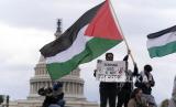 Gedung Capitol AS terlihat di balik bendera Palestina saat orang-orang berunjuk rasa di National Mall selama demonstrasi pro-Palestina di Washington, Jumat, (20/10/2023). (FOTO : AP Photo/Jose Luis Magana)