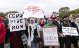 Selama aksi mereka membawa poster dan bendera Palestina untuk mendesak kongres AS menghentikan pembantaian warga Palestina.