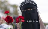 Seorang demonstran membawa bunga saat menggelar unjuk rasa di National Mall saat demonstrasi pro-Palestina di Washington, Jumat, (20/10/2023) (FOTO : AP Photo/Jose Luis Magana)
