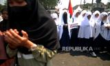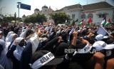 Pelajar dan santri mengikuti aksi damai Indonesia Turun Tangan Bantu Palestina di Titik Nol Kilometer Yogyakarta, Sabtu (21/10/2023). Aksi damai bantu Palestina kali ini diikuti oleh pelajar, santri, dan mahasiswa di Yogyakarta. Pada aksi ini mereka mengutuk kebiadaban Israel usai mengebom rumah sakit yang menewaskan 500 warga Palestina. Selain orasi juga dilakukan penggalangan dana bantuan dan ditutup dengan doa bersama bagi rakyat Palestina. (FOTO : Republika/Wihdan Hidayat)
