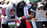 Peserta mengikuti aksi damai Indonesia Turun Tangan Bantu Palestina di Titik Nol Kilometer Yogyakarta, Sabtu (21/10/2023). Aksi damai bantu Palestina kali ini diikuti oleh pelajar, santri, dan mahasiswa di Yogyakarta. Pada aksi ini mereka mengutuk kebiadaban Israel usai mengebom rumah sakit yang menewaskan 500 warga Palestina. Selain orasi juga dilakukan penggalangan dana bantuan dan ditutup dengan doa bersama bagi rakyat Palestina. (FOTO : Republika/Wihdan Hidayat)