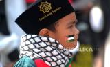 Pelajar bergaya pejuang Palestina mengikuti aksi damai Indonesia Turun Tangan Bantu Palestina di Titik Nol Kilometer Yogyakarta, Sabtu (21/10/2023). Aksi damai bantu Palestina kali ini diikuti oleh pelajar, santri, dan mahasiswa di Yogyakarta. Pada aksi ini mereka mengutuk kebiadaban Israel usai mengebom rumah sakit yang menewaskan 500 warga Palestina. Selain orasi juga dilakukan penggalangan dana bantuan dan ditutup dengan doa bersama bagi rakyat Palestina. (FOTO : Republika/Wihdan Hidayat)