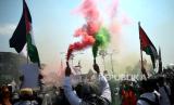 Peserta menyalakan suar saat mengikuti aksi damai Indonesia Turun Tangan Bantu Palestina di Titik Nol Kilometer Yogyakarta, Sabtu (21/10/2023). Aksi damai bantu Palestina kali ini diikuti oleh pelajar, santri, dan mahasiswa di Yogyakarta. Pada aksi ini mereka mengutuk kebiadaban Israel usai mengebom rumah sakit yang menewaskan 500 warga Palestina. Selain orasi juga dilakukan penggalangan dana bantuan dan ditutup dengan doa bersama bagi rakyat Palestina. (FOTO : Republika/Wihdan Hidayat)