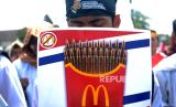 Peserta membawa poster boikot McD saat mengikuti aksi damai Indonesia Turun Tangan Bantu Palestina di Titik Nol Kilometer Yogyakarta, Sabtu (21/10/2023). Aksi damai bantu Palestina kali ini diikuti oleh pelajar, santri, dan mahasiswa di Yogyakarta. Pada aksi ini mereka mengutuk kebiadaban Israel usai mengebom rumah sakit yang menewaskan 500 warga Palestina. Selain orasi juga dilakukan penggalangan dana bantuan dan ditutup dengan doa bersama bagi rakyat Palestina. (FOTO : Republika/Wihdan Hidayat)
