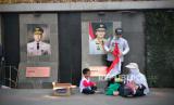 Massa aksi beristirahat di dekat deretan foto gubernur Jawa Barat di Lapangan Gasibu, Bandung, Sabtu (21/10/2023). Ribuan massa Aksi Jawa Barat Bela Palestina berjalan melakukan longmarch dari Gedung Sate menuju Gedung Merdeka Bandung, Aksi ini sebagai dukungan kepada warga Palestina dan mengecam bombardemen militer Israel ke kawasan Gaza, Palestina. (FOTO : Republika/ Yogi Ardhi)