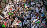 Ribuan massa Aksi Jawa Barat Bela Palestina berjalan melakukan longmarch dari Gedung Sate menuju Gedung Merdeka Bandung, Aksi ini sebagai dukungan kepada warga Palestina dan mengecam bombardemen militer Israel ke kawasan Gaza, Palestina.