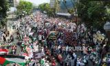 Ribuan massa mengikuti aksi solidaritas Palestina, di Kota Bandung, Sabtu (21/10/2023). Aksi tersebut di antaranya menuntut agar pemerintah Indonesia dan internasional membela rakyat. (FOTO : Republika/ Edi Yusuf)