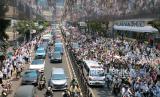 Massa aksi longmarch menunggu keberangkatan dari Lapangan Gasibu, Bandung, Sabtu (21/10/2023). Ribuan massa Aksi Jawa Barat Bela Palestina berjalan melakukan longmarch dari Gedung Sate menuju Gedung Merdeka Bandung, Aksi ini sebagai dukungan kepada warga Palestina dan mengecam bombardemen militer Israel ke kawasan Gaza, Palestina. (FOTO : Republika/ Yogi Ardhi)
