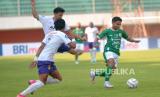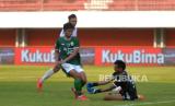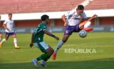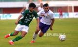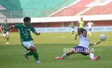 Penyerang PSS Sleman, Hokky Caraka berhasil melewati bek tengah Persik Kediri Al Hamra Hehanussa pada pertandingan pekan ke-16 BRI Liga 1 2023-2024 di Stadion Maguwoharjo, Sleman, Yogyakarta, Sabtu (21/10/2023). Pada pertandingan ini tim tamu Persik Kediri berhasil memaksa berbagi poin dengan tuan rumah PSS Sleman dengan skor 2-2. (FOTO : Republika/Wihdan Hidayat)