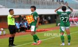 Dua pemain PSS Sleman, Hokky Caraka dan Irkham Mila memrotes asisten wasit usai menganulir gol ke gawang Persik Kediri pada pertandingan pekan ke-16 BRI Liga 1 2023-2024 di Stadion Maguwoharjo, Sleman, Yogyakarta, Sabtu (21/10/2023). Pada pertandingan ini tim tamu Persik Kediri berhasil memaksa berbagi poin dengan tuan rumah PSS Sleman dengan skor 2-2. (FOTO : Republika/Wihdan Hidayat)