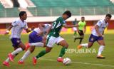 Penyerang PSS Sleman, Hokky Caraka melewati dua pemain belakang Persik Kediri pada pertandingan pekan ke-16 BRI Liga 1 2023-2024 di Stadion Maguwoharjo, Sleman, Yogyakarta, Sabtu (21/10/2023). Pada pertandingan ini tim tamu Persik Kediri berhasil memaksa berbagi poin dengan tuan rumah PSS Sleman dengan skor 2-2. (FOTO : Republika/Wihdan Hidayat)