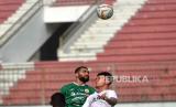 Bek tengah PSS Sleman, Jihad Ayoub duel udara dengan bek tengah bertahan Persik Kediri Al Hamra Hehanussa pada pertandingan pekan ke-16 BRI Liga 1 2023-2024 di Stadion Maguwoharjo, Sleman, Yogyakarta, Sabtu (21/10/2023). Pada pertandingan ini tim tamu Persik Kediri berhasil memaksa berbagi poin dengan tuan rumah PSS Sleman dengan skor 2-2. (FOTO : Republika/Wihdan Hidayat)