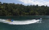 Sejumlah wisatawan asal China menikmati wahana air banana boat saat berwisata di Pantai Undaro, Desa Bete-bete, Kabupaten Morowali, Sulawesi Tengah, Ahad (22/10/2023). Wisata yang berada di kawasan lingkar tambang tersebut ramai dikunjungi wisatawan dan menjadi salah satu pusat berlibur bagi pekerja tambang Nikel di daerah tersebut dan keberadaannya meningkatkan pendapatan UMKM desa setempat. (FOTO : ANTARA FOTO/Mohamad Hamzah)