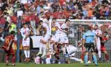 Leandro Paredes dari Roma melakukan tendangan bebas ke arah kiri gawang saat pertandingan sepak bola Serie A Italia antara AS Roma dan AC Monza, di Stadio Olimpico, di Roma, Ahad, (22/10/2023). (FOTO : Alfredo Falcone/LaPresse via AP)