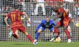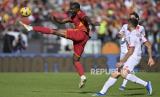 Romelu Lukaku dari Roma menendang bola dalam pertandingan sepak bola Serie A Italia antara AS Roma dan AC Monza, di Stadio Olimpico, di Roma, Ahad, (22/10/2023). (FOTO : AP Photo/Alfredo Falcone)