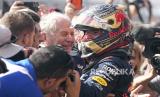Pembalap Red Bull Max Verstappen melakukan selebrasi bersama para penggemarnya setelah memenangkan balapan mobil Grand Prix Formula Satu di Sirkuit CoTA, Austin, Texas,  Amerika, Senin (23/10/2023) dini hari WIB. (FOTO : AP Photo/Darron Cummings)