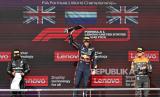 Pembalap Mercedes asal Inggris Lewis Hamilton, pembalap Red Bull Racing asal Belanda Max Verstappen dan pembalap McLaren asal Inggris Lando Norris (dari kiri) berdiri di podium menerima piala usai menjuari Grand Prix Formula Satu di Sirkuit CoTA, Austin, Texas,  Amerika, Senin (23/10/2023) dini hari WIB. (FOTO : Jim WATSON / AFP)