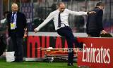 Pelatih Juventus asal Italia Massimiliano Allegri menendang papan iklan saat pertandingan sepak bola Serie A Italia antara Milan dan Juventus di Stadion San Siro, di Milan, Italia, Senin (23/10/2023) dini hari WIB. (FOTO : Marco BERTORELLO / AFP)