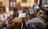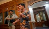 Wali Kota Surakarta, Gibran Rakabuming Raka menjawab pertanyaan wartawan saat meninggalkan ruang kerja di Balai Kota Surakarta, Jawa Tengah, Senin (23/10/2023). Sehari usai dikukuhkan sebagai Bacawapres Prabowo pada Pilpres 2024, Gibran kembali terlihat di Balai Kota Surakarta. Gibran juga mengaku belum mengajukan cuti jelang Pilpres 2024, dan saat ini hanya fokus mengerjakan program kerja yang masih ada di Surakarta. (FOTO : Republika/Wihdan Hidayat)