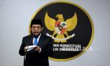 Ketua Mahkamah Konstitusi (MK) periode 2003-2008 Jimly Asshiddiqie usai dilantik menjadi anggota Majelis Kehormatan Mahkamah Konstitusi (MKMK) di Aula Gedung II MK, Jakarta, Selasa (24/10/2023). Mahkamah Konstitusi (MK) telah membentuk Majelis Kehormatan Mahkamah Konstitusi (MKMK). MKMK beranggotakan tiga orang terdiri dari Wahiduddin Adams (unsur Hakim Konstitusi), Jimly Asshiddiqie (unsur Tokoh Masyarakat) dan Bintan R. Saragih (unsur akademisi berlatar belakang bidang hukum). Merujuk Peraturan Mahkamah Konstitusi Nomor 1 Tahun 2023 tentang Majelis Kehormatan Mahkamah Konstitusi, MKMK adalah perangkat yang dibentuk MK untuk menjaga dan menegakkan kehormatan, keluhuran, dan martabat. Selain itu, MKMK dibentuk untuk menjaga Kode Etik dan Perilaku Hakim Konstitusi. (FOTO : Republika/Prayogi)