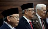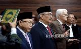 Ketua Mahkamah Konstitusi (MK) periode 2003-2008 Jimly Asshiddiqie (tengah), Akademisi Bintan Saragih (dua kanan) dan Hakim Konstitusi Wahiduddin Adams (kiri) mengucapkan sumpah dalam acara pelantikan anggota Majelis Kehormatan Mahkamah Konstitusi (MKMK) di Aula Gedung II MK, Jakarta, Selasa (24/10/2023). Mahkamah Konstitusi (MK) telah membentuk Majelis Kehormatan Mahkamah Konstitusi (MKMK). MKMK beranggotakan tiga orang terdiri dari Wahiduddin Adams (unsur Hakim Konstitusi), Jimly Asshiddiqie (unsur Tokoh Masyarakat) dan Bintan R. Saragih (unsur akademisi berlatar belakang bidang hukum). Merujuk Peraturan Mahkamah Konstitusi Nomor 1 Tahun 2023 tentang Majelis Kehormatan Mahkamah Konstitusi, MKMK adalah perangkat yang dibentuk MK untuk menjaga dan menegakkan kehormatan, keluhuran, dan martabat. Selain itu, MKMK dibentuk untuk menjaga Kode Etik dan Perilaku Hakim Konstitusi. (FOTO : Republika/Prayogi)