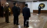 Ketua Mahkamah Konstitusi (MK) Anwar Usman hadir dalam acara pelantikan anggota Majelis Kehormatan Mahkamah Konstitusi (MKMK) di Aula Gedung II MK, Jakarta, Selasa (24/10/2023). Mahkamah Konstitusi (MK) telah membentuk Majelis Kehormatan Mahkamah Konstitusi (MKMK). MKMK beranggotakan tiga orang terdiri dari Wahiduddin Adams (unsur Hakim Konstitusi), Jimly Asshiddiqie (unsur Tokoh Masyarakat) dan Bintan R. Saragih (unsur akademisi berlatar belakang bidang hukum). Merujuk Peraturan Mahkamah Konstitusi Nomor 1 Tahun 2023 tentang Majelis Kehormatan Mahkamah Konstitusi, MKMK adalah perangkat yang dibentuk MK untuk menjaga dan menegakkan kehormatan, keluhuran, dan martabat. Selain itu, MKMK dibentuk untuk menjaga Kode Etik dan Perilaku Hakim Konstitusi. (FOTO : Republika/Prayogi)