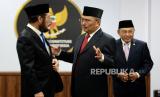 Ketua Mahkamah Konstitusi (MK) periode 2003-2008 Jimly Asshiddiqie (tengah), Akademisi Bintan Saragih (Kanan) dan Hakim Konstitusi Wahiduddin Adams (kiri) mengikuti acara pelantikan anggota Majelis Kehormatan Mahkamah Konstitusi (MKMK) di Aula Gedung II MK, Jakarta, Selasa (24/10/2023). Mahkamah Konstitusi (MK) telah membentuk Majelis Kehormatan Mahkamah Konstitusi (MKMK). MKMK beranggotakan tiga orang terdiri dari Wahiduddin Adams (unsur Hakim Konstitusi), Jimly Asshiddiqie (unsur Tokoh Masyarakat) dan Bintan R. Saragih (unsur akademisi berlatar belakang bidang hukum). Merujuk Peraturan Mahkamah Konstitusi Nomor 1 Tahun 2023 tentang Majelis Kehormatan Mahkamah Konstitusi, MKMK adalah perangkat yang dibentuk MK untuk menjaga dan menegakkan kehormatan, keluhuran, dan martabat. Selain itu, MKMK dibentuk untuk menjaga Kode Etik dan Perilaku Hakim Konstitusi. (FOTO : Republika/Prayogi)