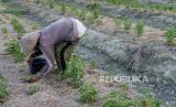 Petani mengganti tanaman cabainya yang mati akibat suhu panas di Desa Porame, Sigi, Sulawesi Tengah, Selasa (24/10/2023). Suhu yang bisa mencapai 39 derajat celcius di siang hari di wilayah itu membuat sebagian tanaman cabai mati dan petani setempat menyiasatinya dengan menutup permukaan lahannya dengan tumpukan jerami padi untuk mengurangi penguapan. (FOTO : Antara/Basri Marzuki)