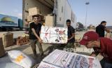 Relawan Mesir menangani bantuan kemanusiaan untuk warga Palestina di Jalur Gaza, di perbatasan Rafah, Mesir, Selasa (24/10/2023). (FOTO : EPA-EFE/Khaled Elfiqi)