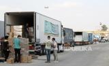 REPUBLIKA.CO.ID,RAFAH -- Konvoi truk bantuan kemanusiaan menuju Jalur Gaza, terlihat diparkir di luar gerbang perbatasan Rafah, di perbatasan Rafah, Mesir, Selasa (24/10/2023).