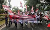REPUBLIKA.CO.ID, JAKARTA. -- Sejumlah pendukung pasangan bacapres Prabowo Subianto dan bacawapres Gibran Rakabuming Raka memeriahkan pawai di depan Gedung KPU RI, Jakarta, Rabu (25/10/2023).