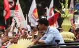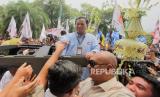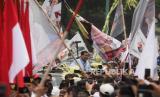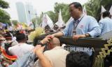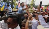 REPUBLIKA.CO.ID, JAKARTA -- Bacapres Prabowo Subianto dan bacawapres Gibran Rakabuming Raka menyalami pendukung saat pawai di depan gedung KPU RI, Jakarta, Rabu (25/10/2023).